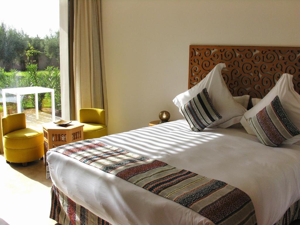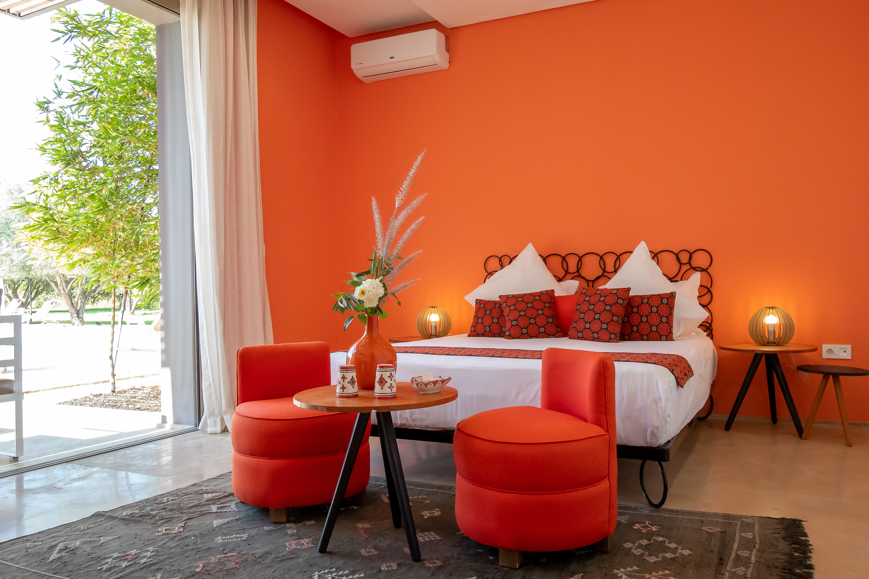 La suite chambre Jacaranda vous émerveillera par sa baie vitrée d’angle et sa vue sur les montagnes de l’Atlas.