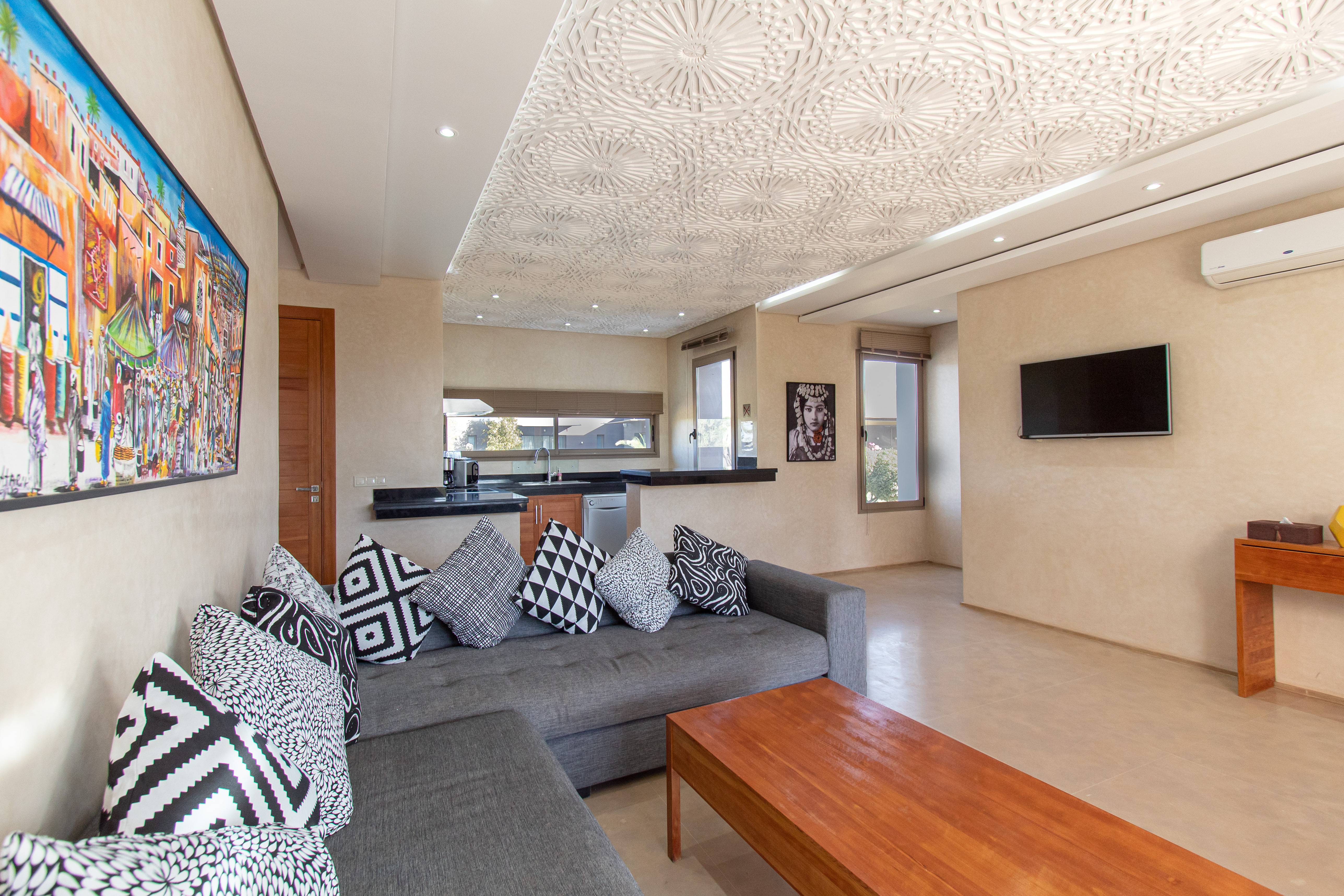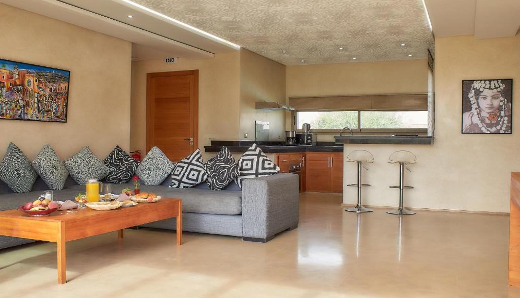 Grande terrasse privée avec vue sur l’allée des oliviers.